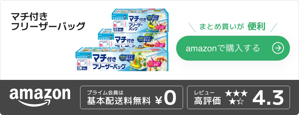 こちらも、保存する場合は、使いやすい分量をNEWクレラップで包んでから、キチントさんマチ付きフリーザーバッグに入れておくことをおすすめします。この状態で約1ヵ月保存できます。