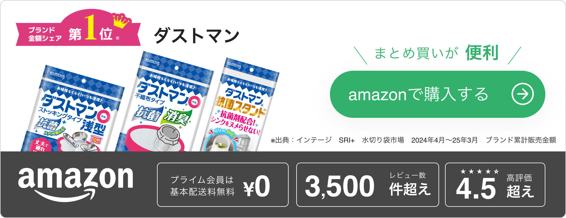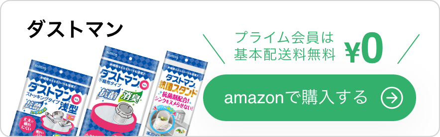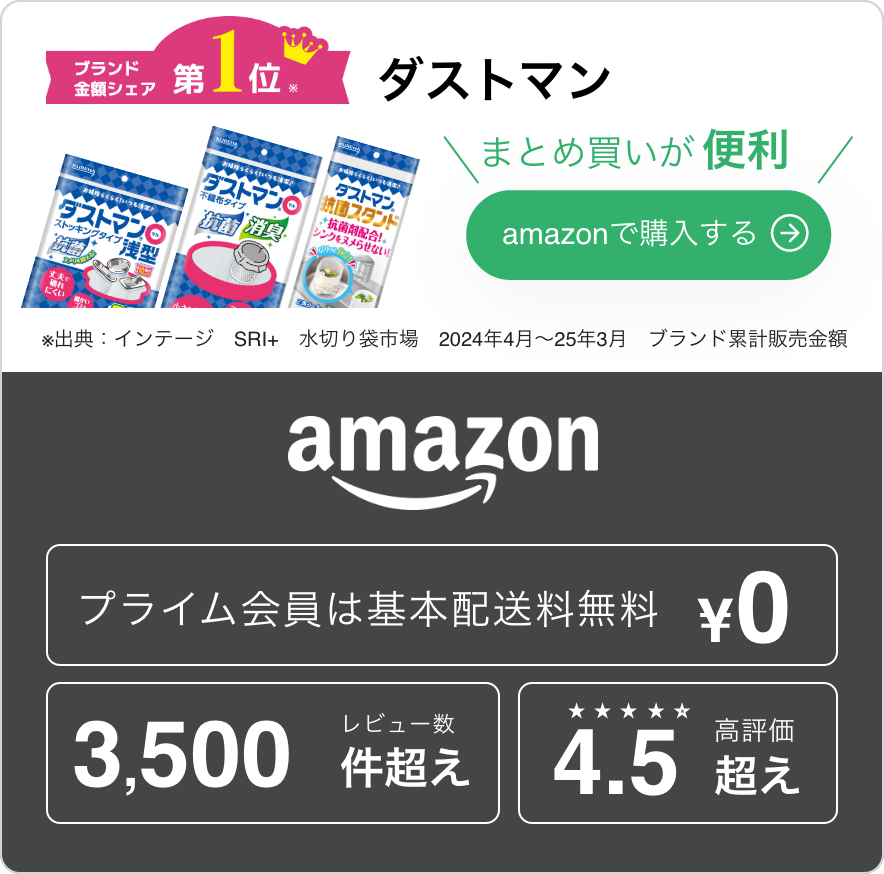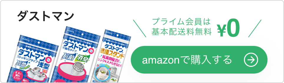 排水口の掃除が楽になる方法の一つとして、ごみ受けに水切り袋をセットするのがおすすめです。水切り袋でごみをキャッチできるので、掃除のときのごみの処分も簡単。 中でもダストマンは、抗菌・消臭効果のある水切り袋なので排水口のヌメリや悪臭を抑制することに役立ちます。