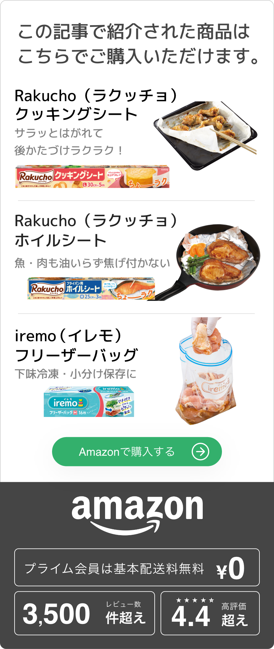 また、みじん切りや千切りが簡単にできるフードプロセッサーや電動スライサー、鍋でそのまま使えるハンドブレンダーなどのキッチングッズも時短の味方です。さらに、Rakucho(ラクッチョ)フライパン用ホイルシートやRakucho(ラクッチョ)クッキングシートを活用したり、肉や色の付きやすい野菜などを切る際に使い捨てのまな板シートを使ったりすれば、洗い物が楽に。下ごしらえした食材をキチントさんマチ付きフリーザーバックで保存しておけば調理の工程も減らせます。