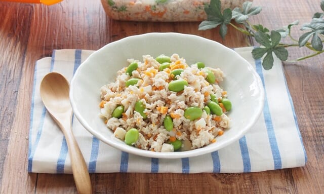ボウルに鶏ひき肉とみじん切りにしたにんじん、れんこん、そして調味料を混ぜ合わせ、電子レンジで加熱。途中、様子を見てかき混ぜてあげてくださいね。最後に彩りとして枝豆を加えると見た目にもおいしそうな「根菜入り塩そぼろ」の完成です!