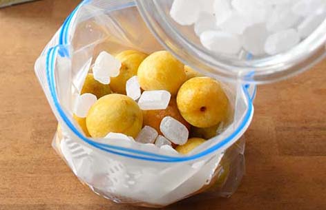 STEP 01 梅をフリーザーバッグに入れて、24時間以上冷凍しておく。凍らせた梅に氷砂糖、はちみつ、酢を入れる。