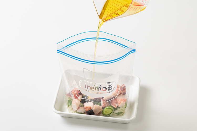 STEP 02 iremo(イレモ)フリーザーバッグ Mに①と黒オリーブ、マリネ液の材料を入れて空気を抜いて閉じ、軽く揉んでから冷蔵庫1~2時間置いておく。