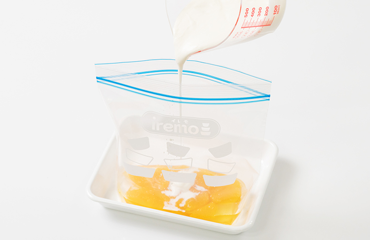 STEP 03 空気を抜いて口を閉じ、平らにして冷凍庫で冷やし固めます。※甘さは好みで調節してください。