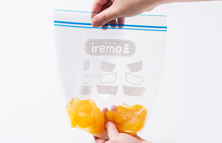 STEP 01 iremo(イレモ)フリーザーバッグ Mに缶詰みかんの果肉とシロップ、グラニュー糖を入れて、手で揉んで軽くみかんを潰します