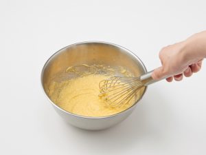 STEP 02 ボウルにバターと砂糖を入れ、白っぽくなるまで混ぜます。卵を加え、さらに混ぜます。