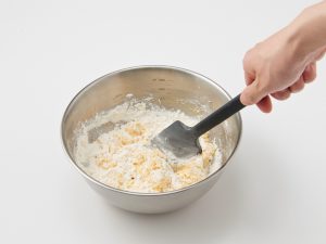 STEP 03 薄力粉をふるいながら加え、ゴムベラでさっくりと混ぜ、手でまとめてプレーン生地を作ります。
