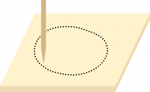 STEP 05 キチントさんの下絵の上にキチントさんクッキングシートを重ねて一緒にはさみで切り、型紙を作ります。