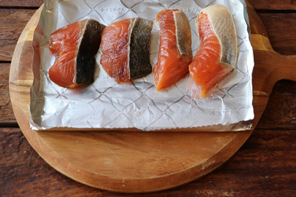 STEP 02 ①の鮭を取り出し、Rakucho(ラクッチョ)フライパン用ホイルシートに並べ、表面に薄くサラダ油を塗ります。トースターで10~15分(1000w)焼きます。お好みでくし型に切ったレモンを添え、食べるときに絞ります。