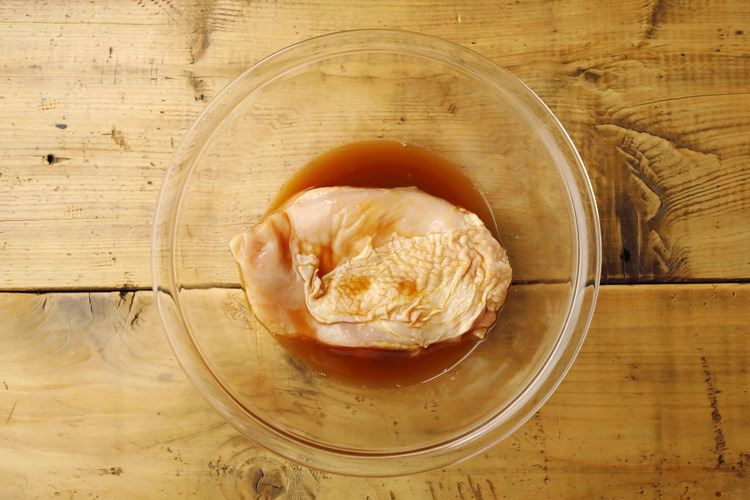 STEP 01 鶏むね肉は、厚みのある部分は包丁で開き、厚みを均等にします。フォークで表・裏とも全体をまんべんなく刺します。