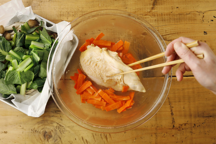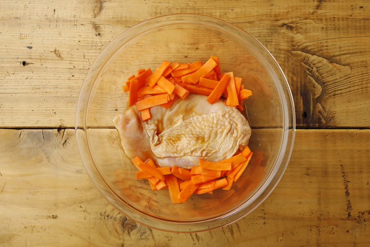 STEP 03 耐熱ボウルにAを入れて混ぜ、鶏むね肉を入れてからめます。にんじんを周囲に置き、キチントさんクッキングシートを落し蓋のようにかぶせます。