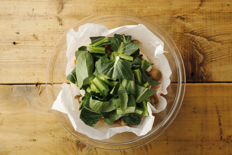 STEP 04 ③のキチントさんクッキングシートの上に小松菜とぶなしめじをのせて、NEWクレラップをかけ、電子レンジ(500W)で5分半加熱します。