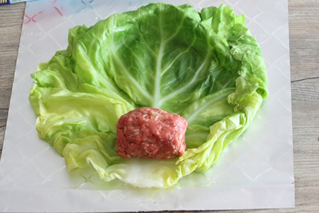 STEP 01 キャベツはNEWクレラップに包み、電子レンジ(500W)で、5分加熱します。キャベツの軸の部分は巻きやすいように薄く削ぎ、みじん切りにします。