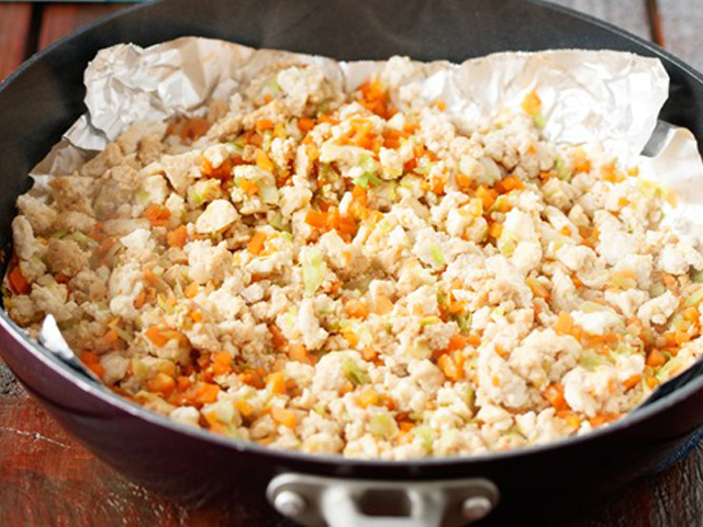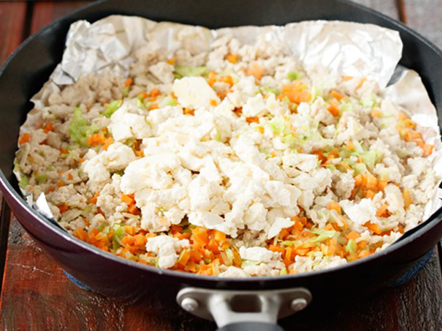 STEP 03 フライパンに新しいホイルシートを敷き、鶏ひき肉を中火で炒めます。