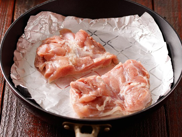 STEP 02 フライパンにRakucho(ラクッチョ)フライパン用ホイルシートを敷き、①の皮目を下にして中火にかけます。ヘラなどで押さえながら7分ほど焼き、裏返してさらに3分ほど焼きます。