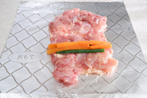 STEP 05 Rakucho(ラクッチョ)フライパン用ホイルシートを広げ、その上に鶏もも肉の皮目を下にして置きます。中央よりやや下にいんげんとにんじんをのせて軸にし、きつく巻いていきます。