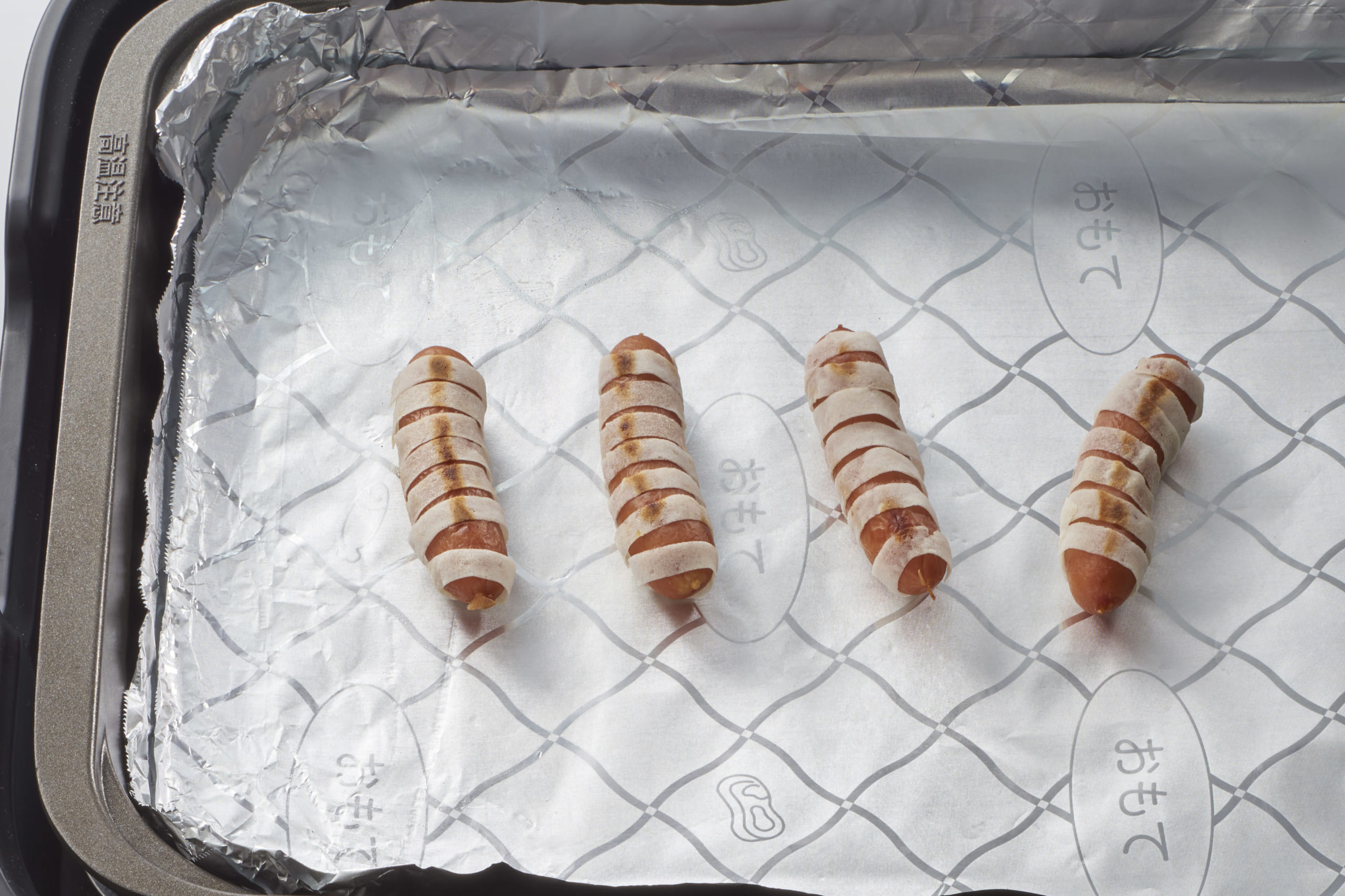 STEP 04 焼きあがったら、ソーセージ1つに対して、チーズとのりで作った目を2個ずつのせます。