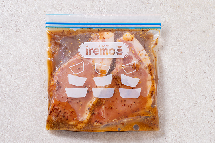 STEP 02 iremo(イレモ)フリーザーバッグ Sに、①、Aを入れてよくもみ込み、10~15分置きます。
