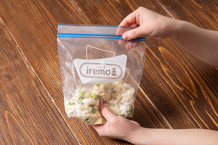 STEP 02 はんぺんが入ったiremo(イレモ)フリーザーバッグ Mに、枝豆、プロセスチーズ、Aを入れ、よくもみ込みます。