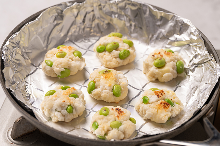 STEP 03 フライパンにRakucho(ラクッチョ)フライパン用ホイルシートを敷き、②を6〜7等分して丸めて並べます。中火にかけ、約3分焼いたら裏返し、もう片面も約2分焼きます。