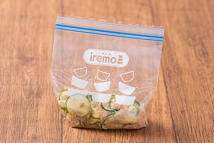STEP 01 ズッキーニはスライサーで薄い輪切りにし、iremo(イレモ)フリーザーバッグ Sに入れます。