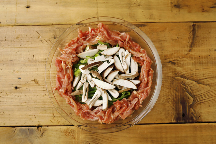 STEP 02 耐熱容器にピーマン、しいたけの順に入れ、豚肉を円形状にのせます。ふんわりとNEWクレラップをかけ、電子レンジ(500W)で約6分加熱します。
