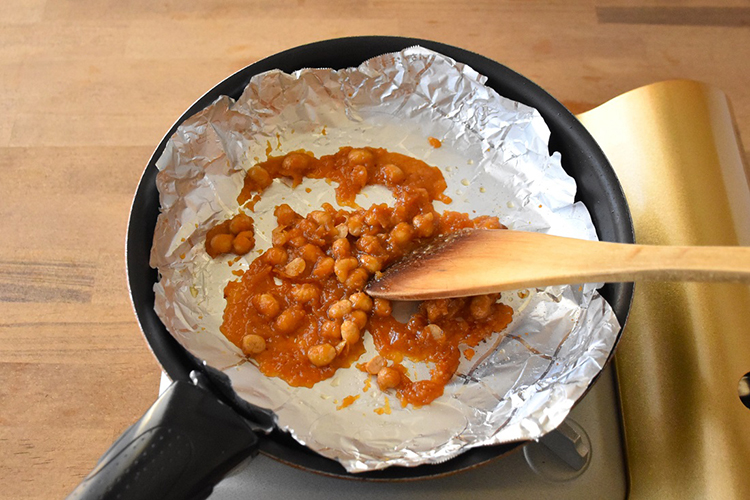STEP 01 フライパンにキチントさんフライパン用ホイルシートを敷き、大豆を入れてさっと炒めます。Aを加えて、お好みで大豆を潰しながら煮絡めます。
