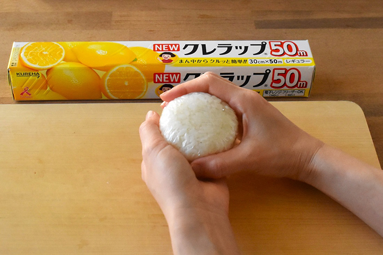 STEP 02 NEWクレラップを広げた上にごはんの1/2をのせ、丸くにぎります。