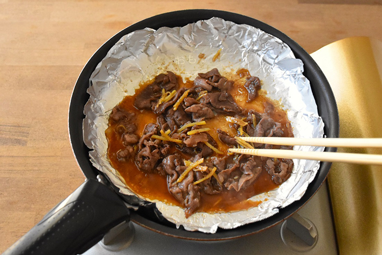 STEP 01 しょうがは皮をむいてせん切りにします。フライパンにキチントさんフライパン用ホイルシートを敷き、牛肉、しょうが、Aを入れて汁気がなくなるまで中火で煮絡めます。