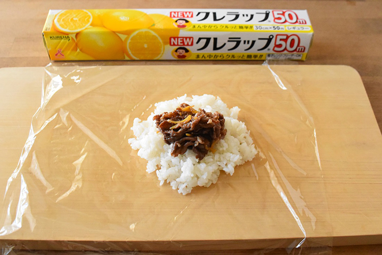 STEP 02 NEWクレラップを広げた上にごはんの1/2をのせ、①の1/2を中央にのせます。