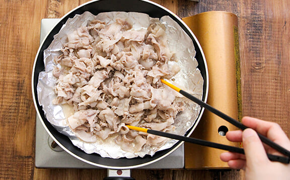 STEP 03 食べる時にレンジ解凍機能で解凍し、Rakucho(ラクッチョ)フライパン用ホイルシートを敷いたフライパンで中火で炒めて火を通します。