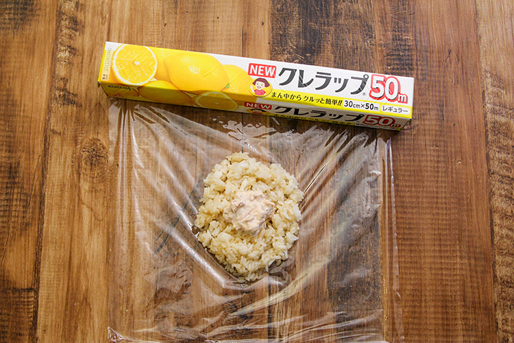 STEP 03 塩を軽くふったNEWクレラップの上にごはんと②をのせます。