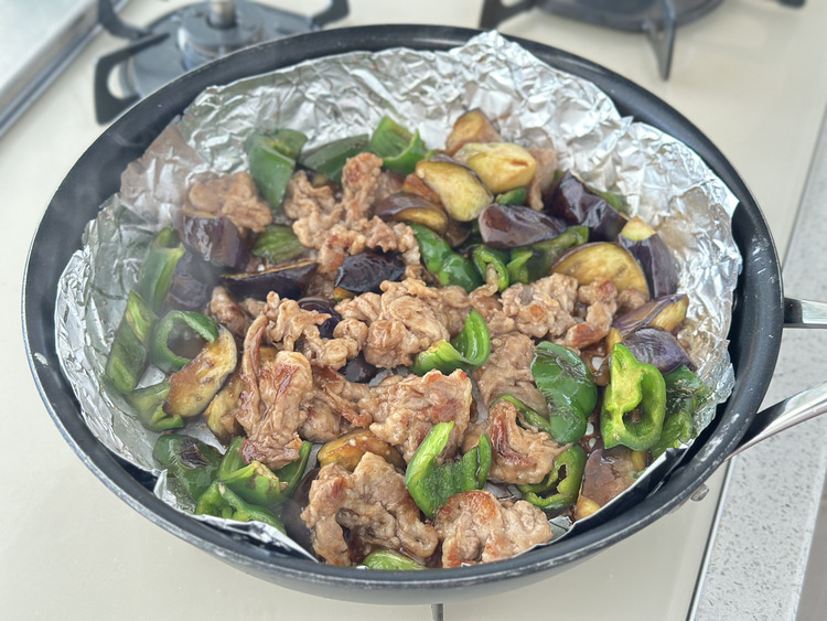 キチントさんフライパン用ホイルシートがあることで、油を使わなくてもなすがとろっと仕上がり、焦げつきの心配もありません。濃いめの甘辛味でごはんがすすみ、フライパンも汚れず後片付けまでラクチンです。