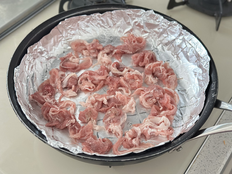STEP 02 フライパンにキチントさんフライパン用ホイルシートを敷き、豚肉を広げて並べます。中火にかけて焼き、全体に火が通ったらいったん取り出します。