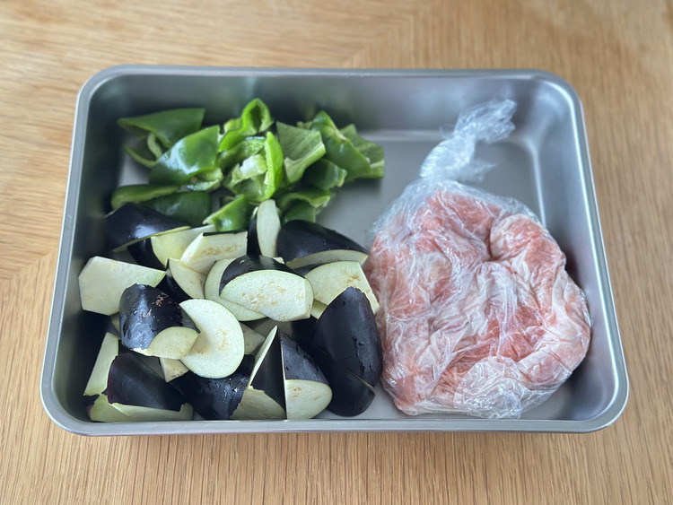 STEP 01 豚肉にAをもみ込みます。なす、ピーマンは乱切りにします。