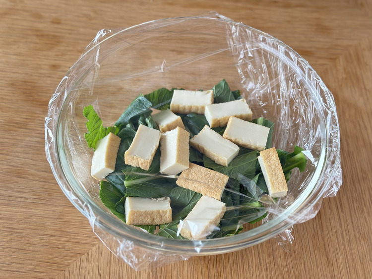 STEP 02 耐熱ボウルに小松菜と厚揚げを入れ、ふんわりとNEWクレラップをかけ、電子レンジ(500W)で4分加熱します。