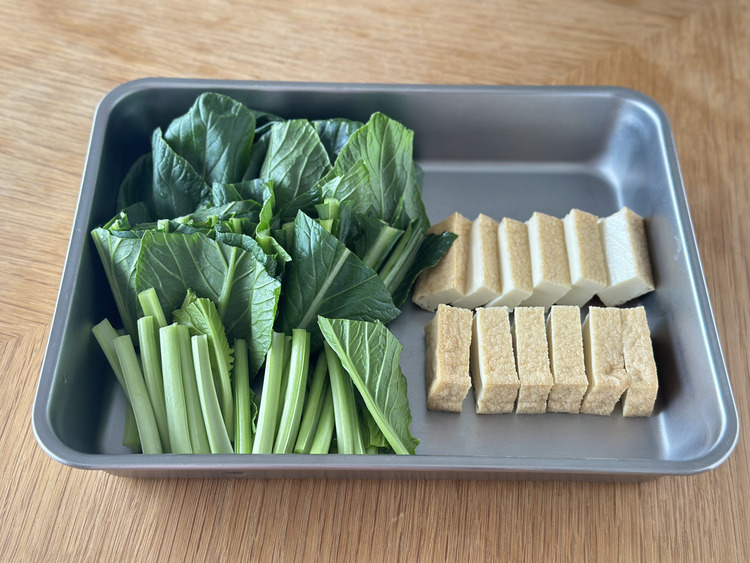 STEP 01 小松菜は3〜4cm長さに切ります。厚揚げは半分に切ってから、1cm幅の短冊切りにします。