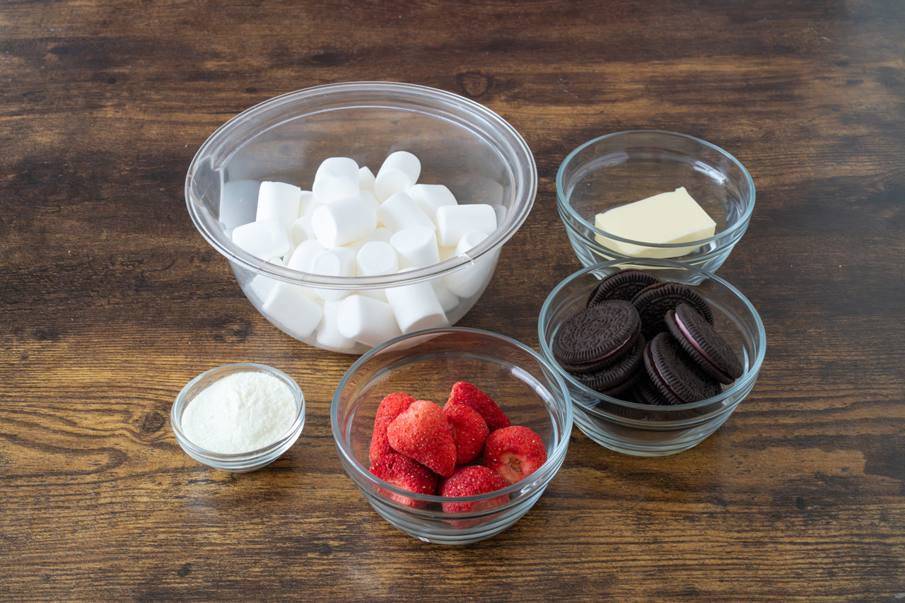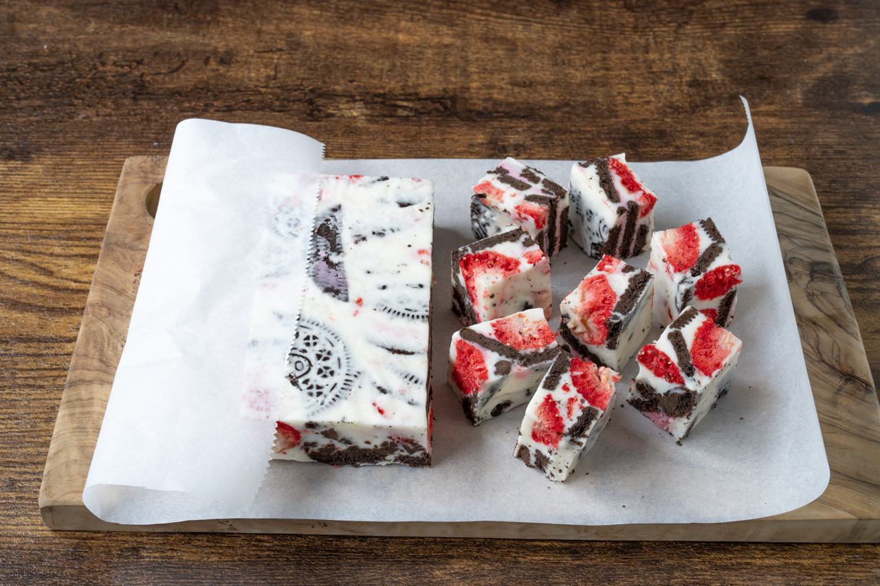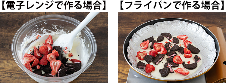 STEP 04 スキムミルクを加え、溶けるまで耐熱性のゴムベラで混ぜます。クリームサンドココアクッキー、フリーズドライいちごを加え、手早く混ぜ合わせます。