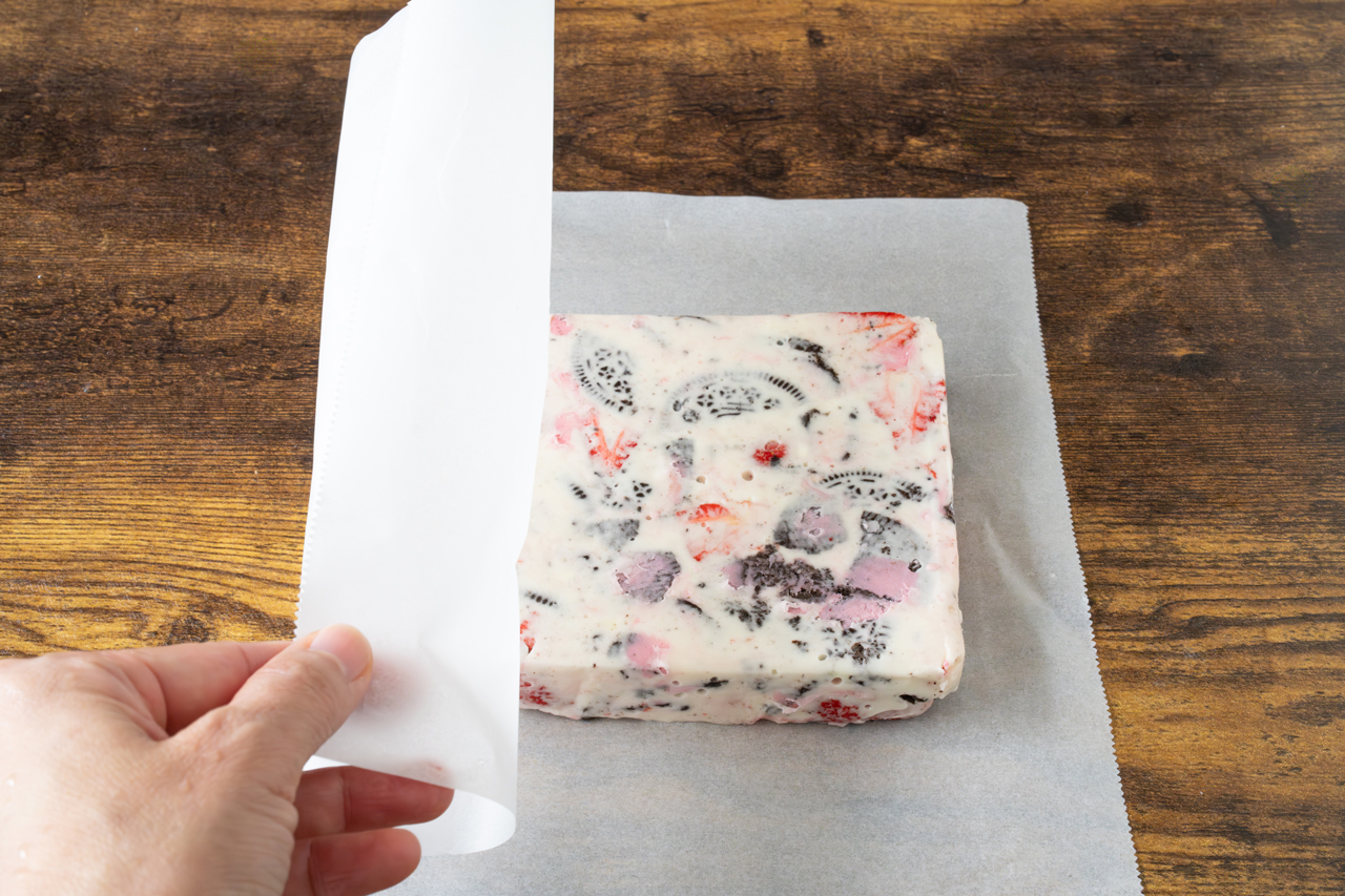 STEP 05 【クッキングシートのみで形を整える作り方】 キチントさんクッキングシートの上に④をおいて包み、12cm四方の正方形になるように形を整えます。このまま、冷蔵庫に入れて2時間以上冷やし固めます。