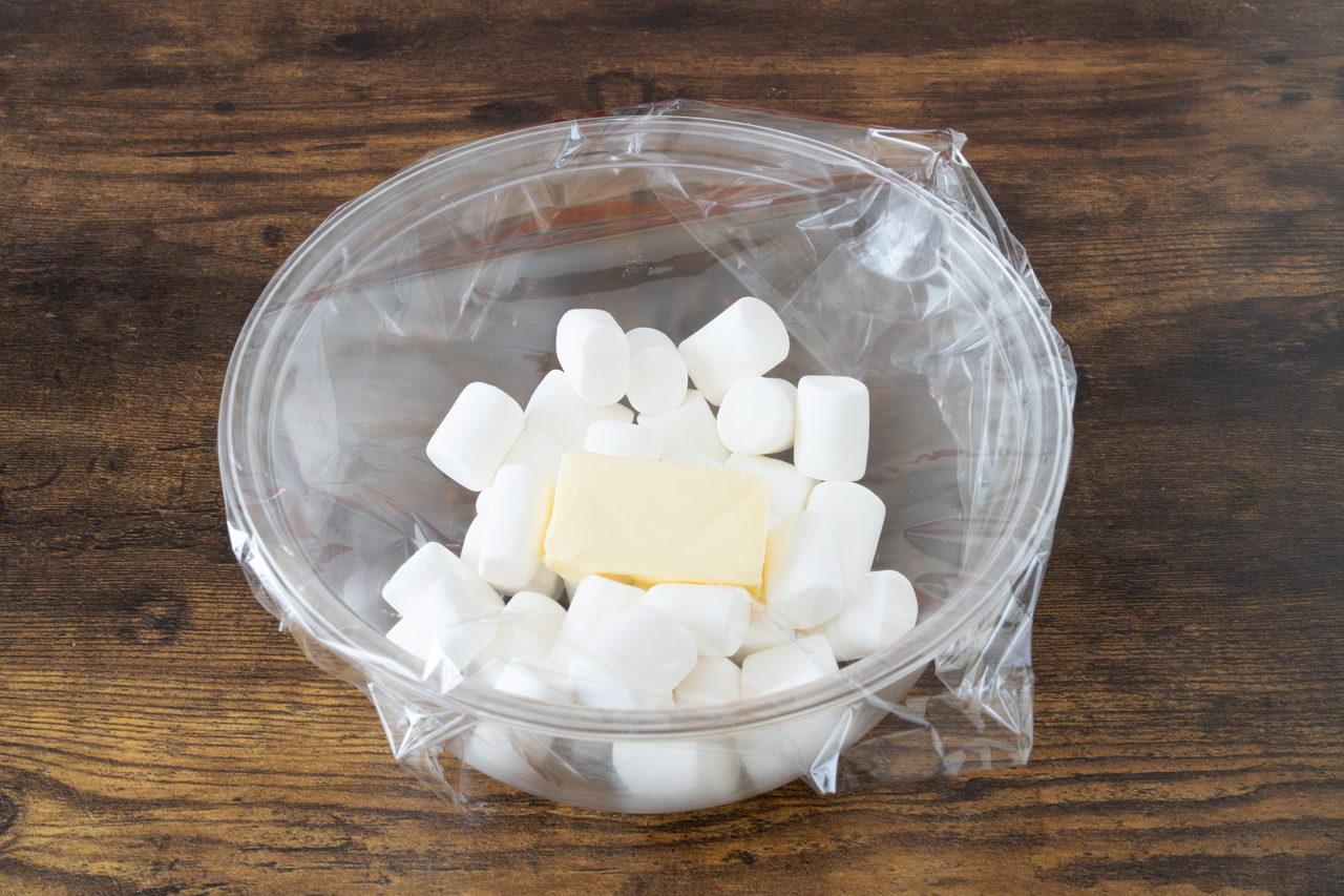 STEP 02 【電子レンジでの作り方】 耐熱ボウルにマシュマロ、バターを入れてふんわりとNEWクレラップをかけ、電子レンジ(600W)で40〜50秒、マシュマロがぷっくりとふくらんで大きくなるまで加熱します。