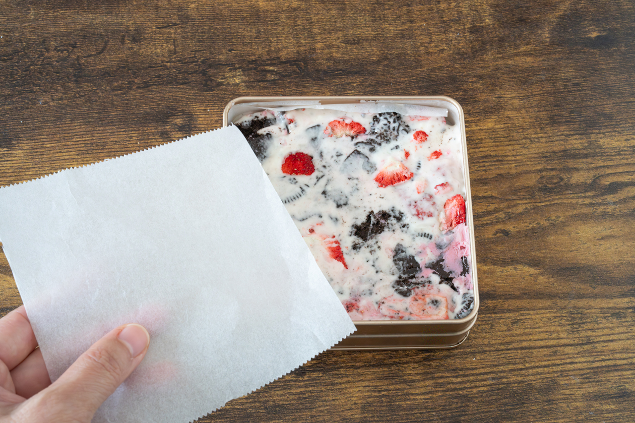 STEP 06 【クッキングシート敷いた型に入れて形を整える作り方】 キチントさんクッキングシートを敷いた12cm四方の容器に④を入れ、上からキチントさんクッキングシートでおさえて平らにし、冷蔵庫に入れて2時間以上冷やし固めます。