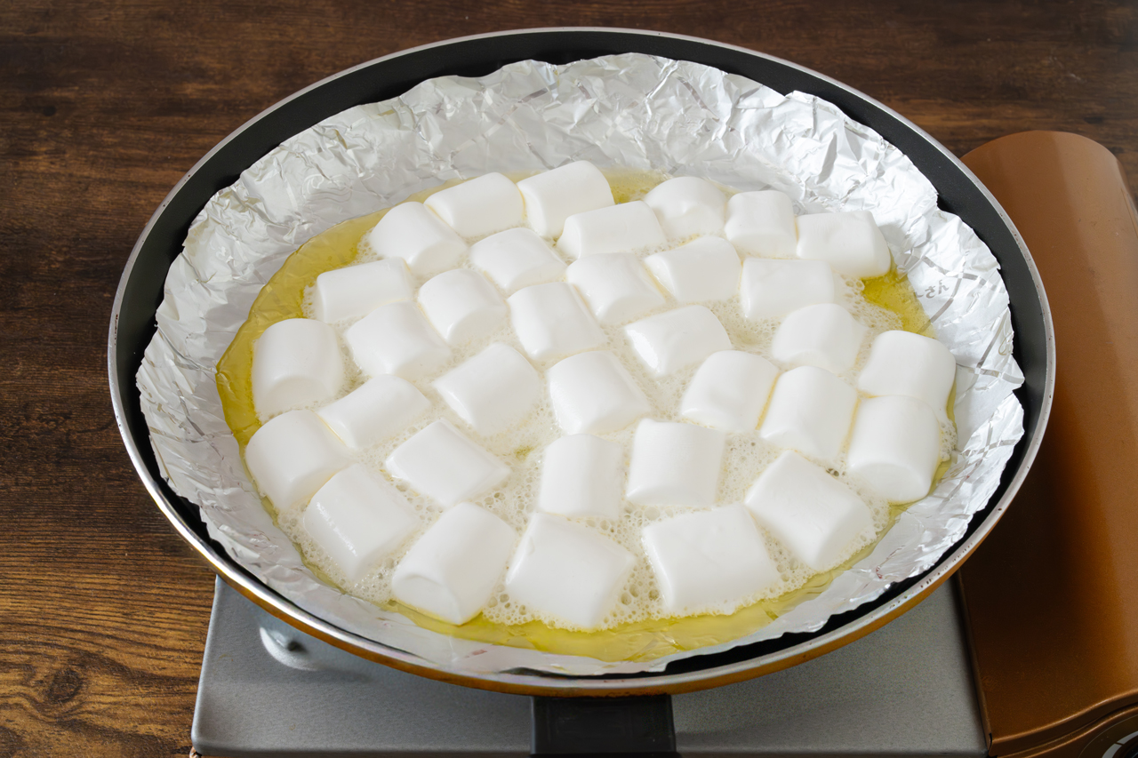 STEP 03 【フライパンでの作り方】 フライパンにキチントさんフライパン用ホイルシートに敷いて、バター、マシュマロを入れて弱火で加熱します。このまましばらく待ち、マシュマロがぷっくりと大きくなったら火を止めます。
