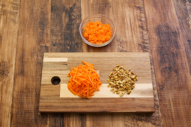 STEP 01 人参はすりおろし、残りは千切りにします。クルミは粗みじん切りにします。