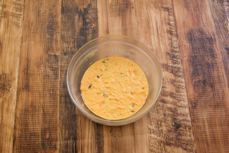 STEP 02 ボウルに卵を溶きほぐし、砂糖、すりおろした人参、ピュアオリーブオイル、シナモンパウダー、ナツメグを混ぜ、ホットケーキミックス、千切りした人参、レーズン、クルミを加えて混ぜ合わます。