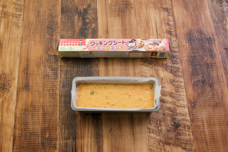 STEP 03 キチントさんクッキングシートを敷いた型に流し入れ、180℃に予熱したオーブンで40分程焼きます。