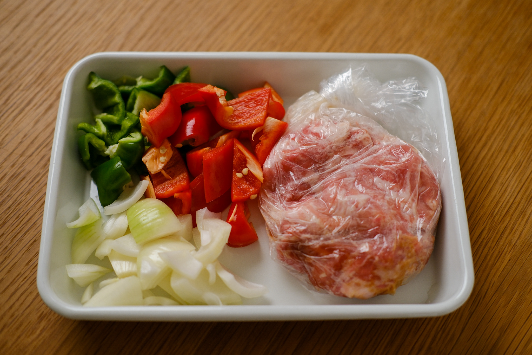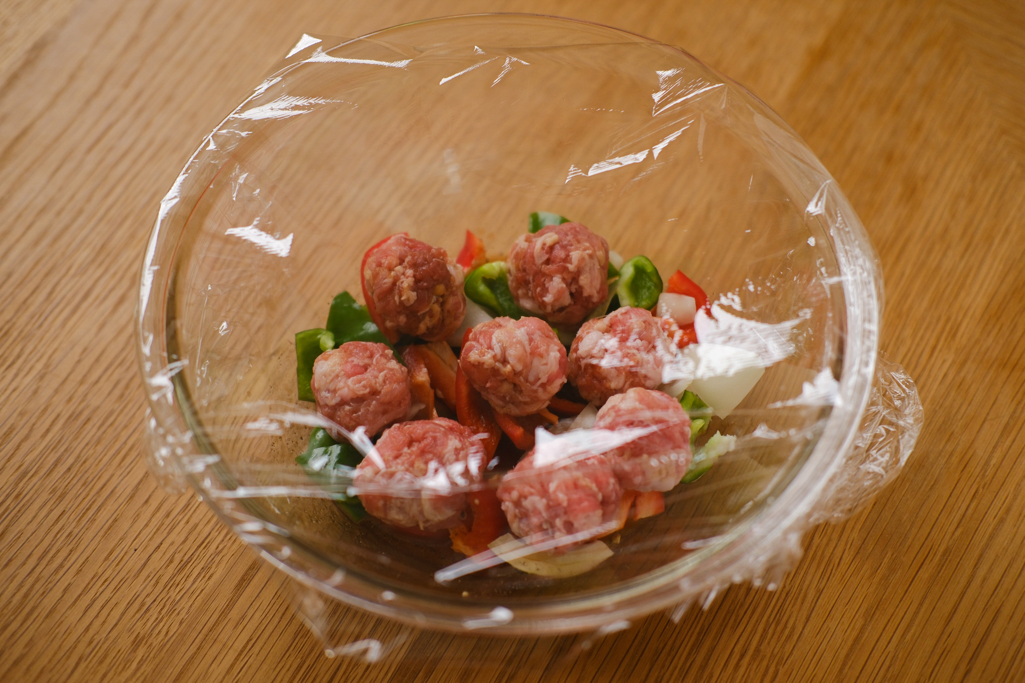 STEP 01 ポリ袋に豚肉、Aを入れてもみ込み、8等分にして丸めます。ピーマン、パプリカ、玉ねぎは小さめの乱切りにします。