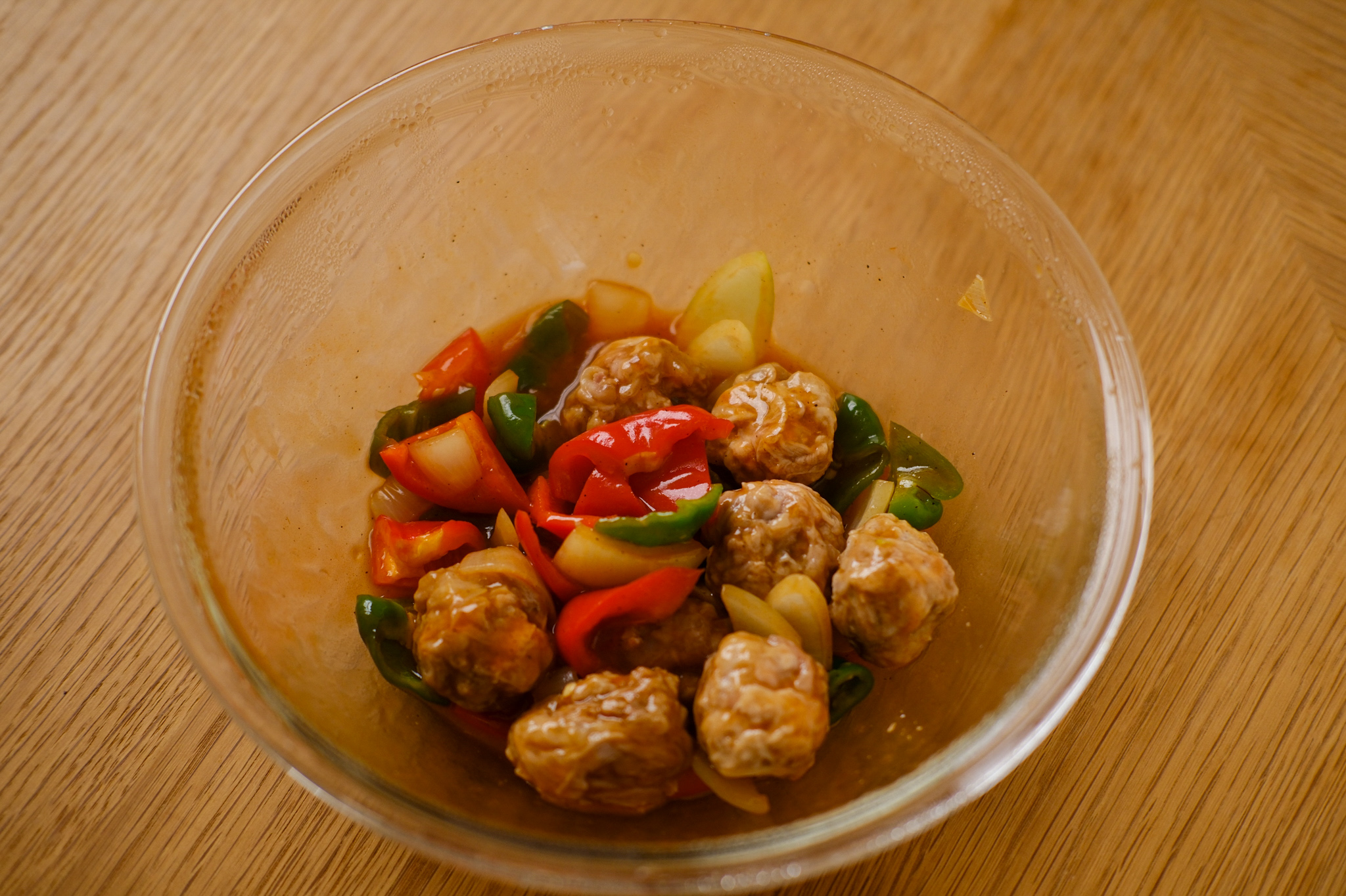揚げずに作れる、手軽な酢豚風おかず。耐熱容器の中で調味料と具材を重ねて加熱するだけで、自然ととろみがつき、失敗しにくいのが魅力。油を使わない分、後片付けもラクで、軽やかな仕上がりになります。