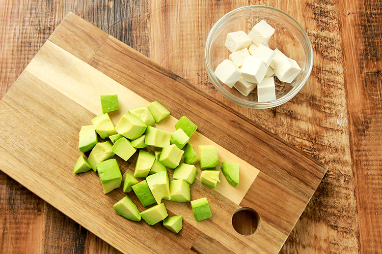 STEP 01 木綿豆腐はキッチンペーパーで包んで重しをのせて水気を切ってから一口大に切る。アボカドは一口大に切る。