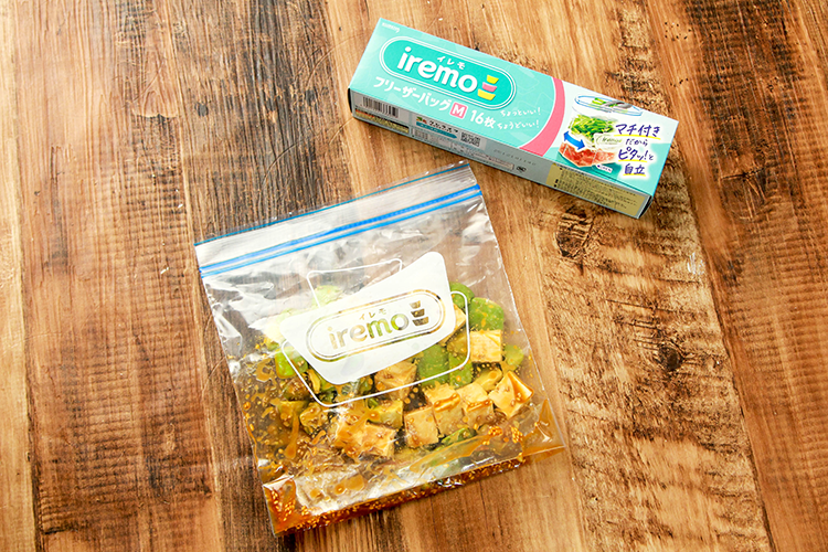 iremo(イレモ)フリーザーバッグに調味料と具材を入れて和えたらそのまま冷蔵庫で冷やすだけ。ボウル不要で洗い物いらず。
