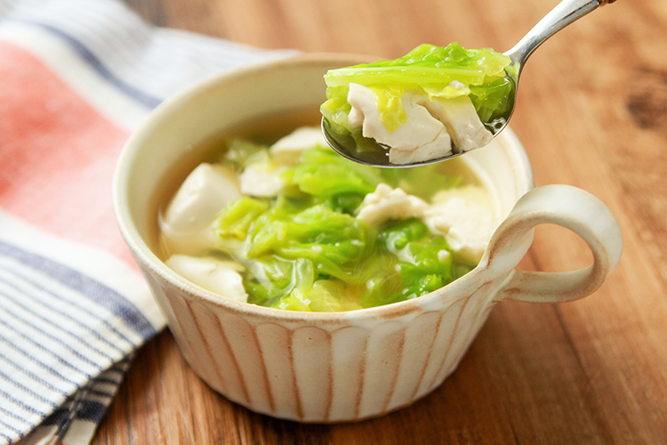 包丁いらずで簡単 レンジで春キャベツと豆腐のスープ